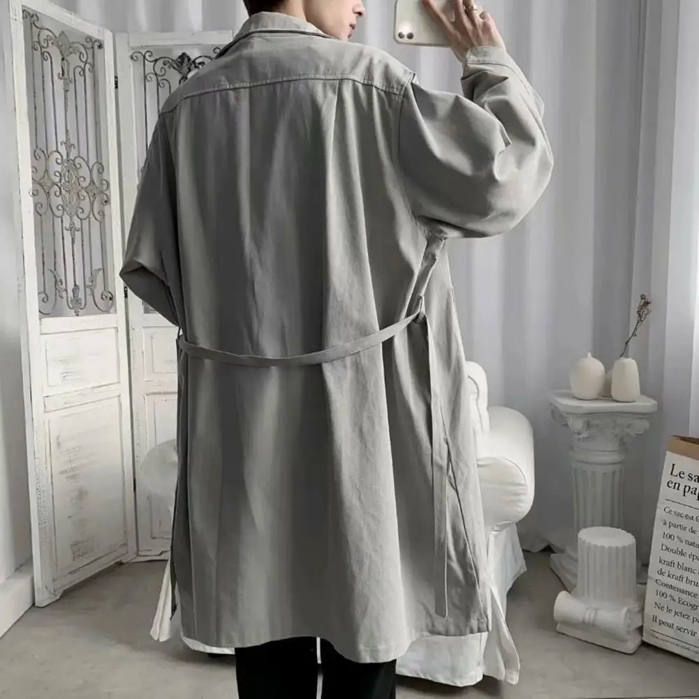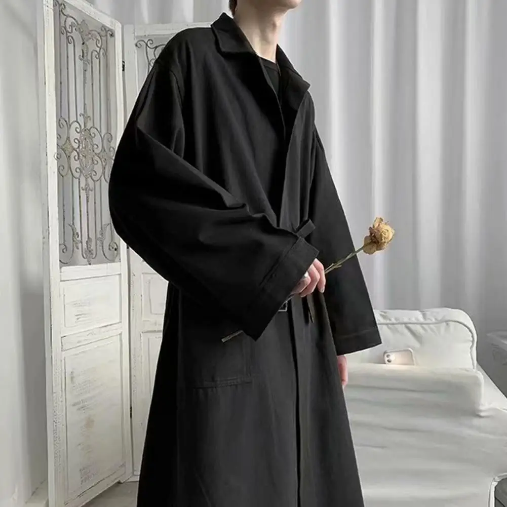 Lapel, button-breasted coat with waist tie for a stylish and tailored look.