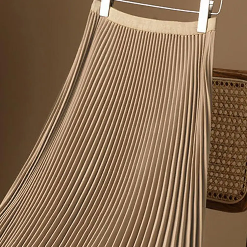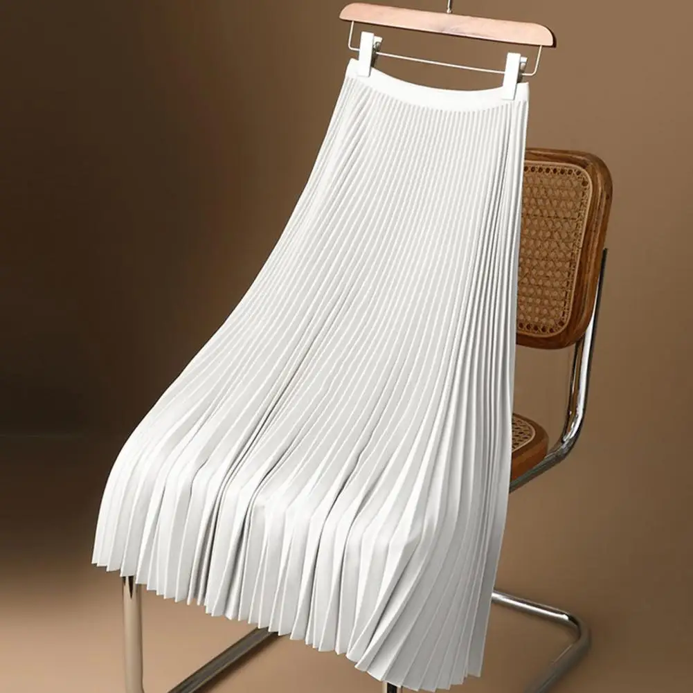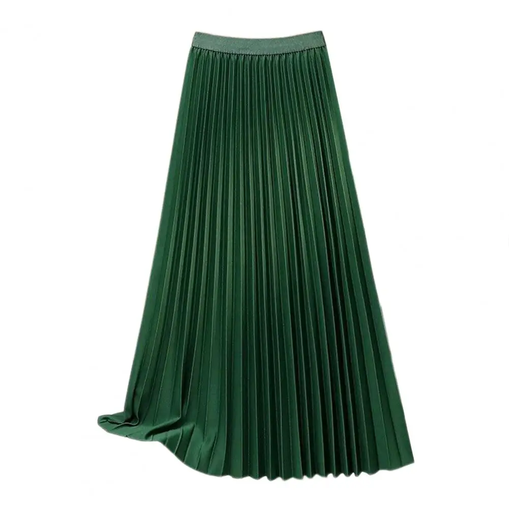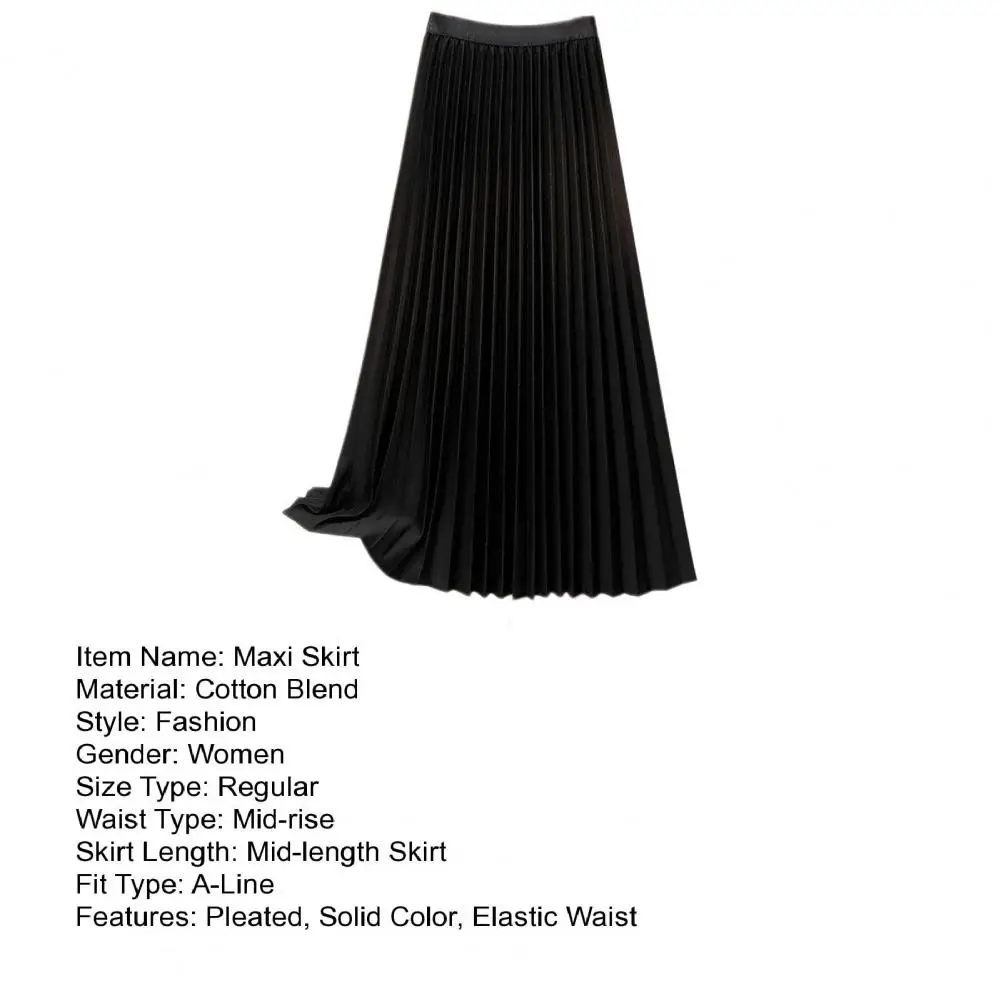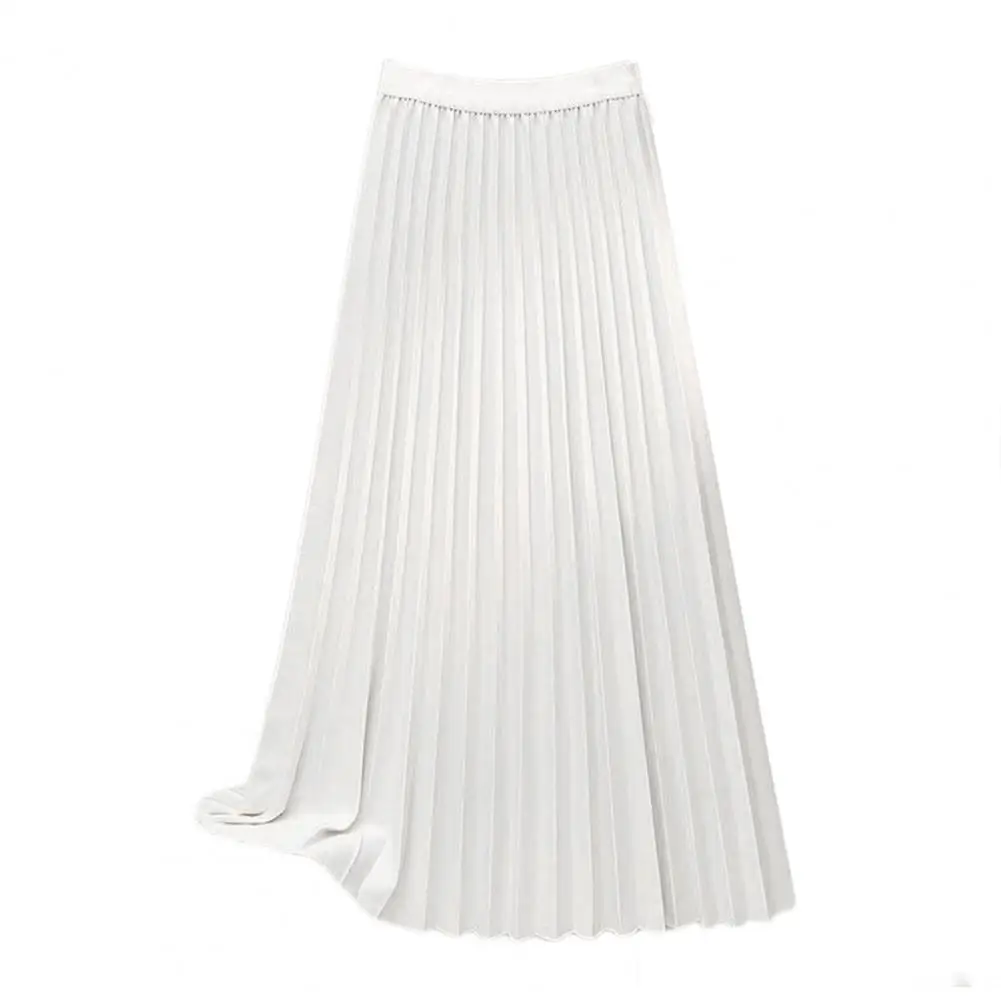 Women Maxi Skirt Elastic High Waist Pleated Skirt Solid Color Smooth Satin A-Line Skirt Work Leisure Wear