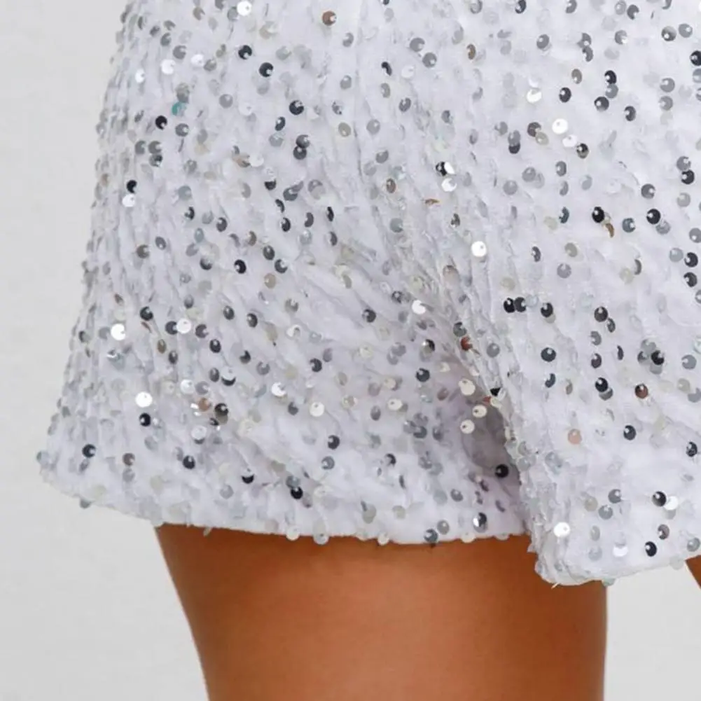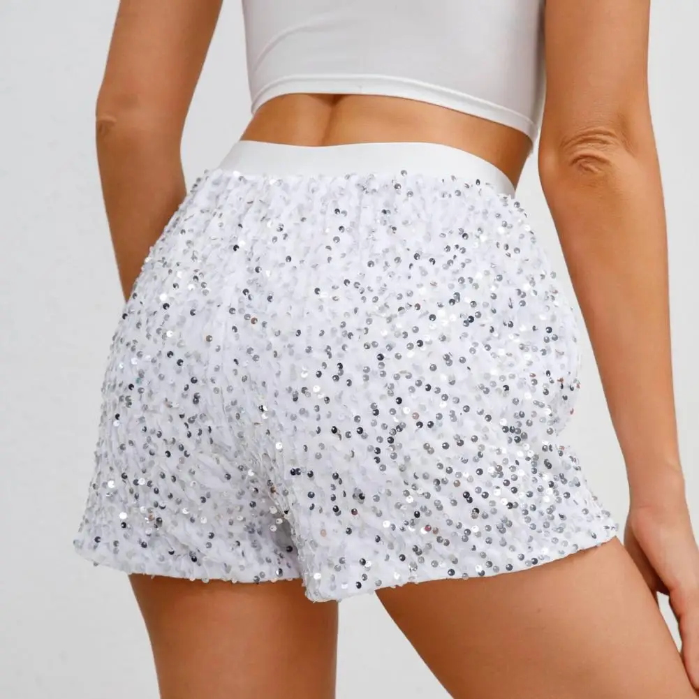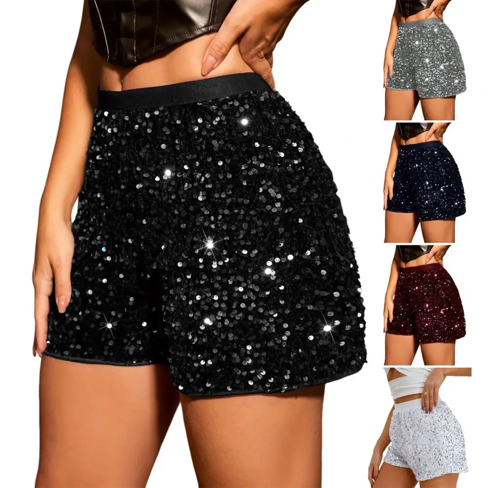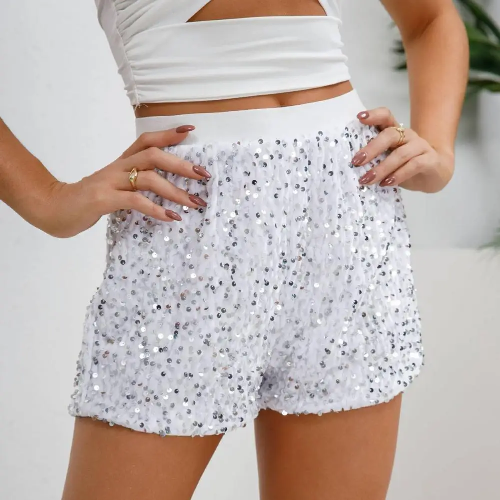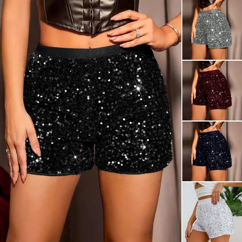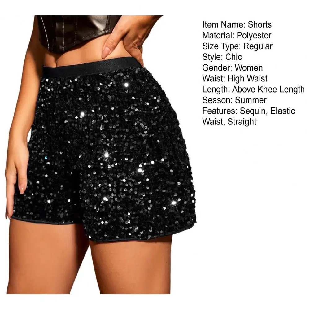 Women Shorts High Waist Sprkling Sequin Elastic Waist Slim Fit Straight Mini Shorts Club Party Dance Short Pants Casual Summer Shorts